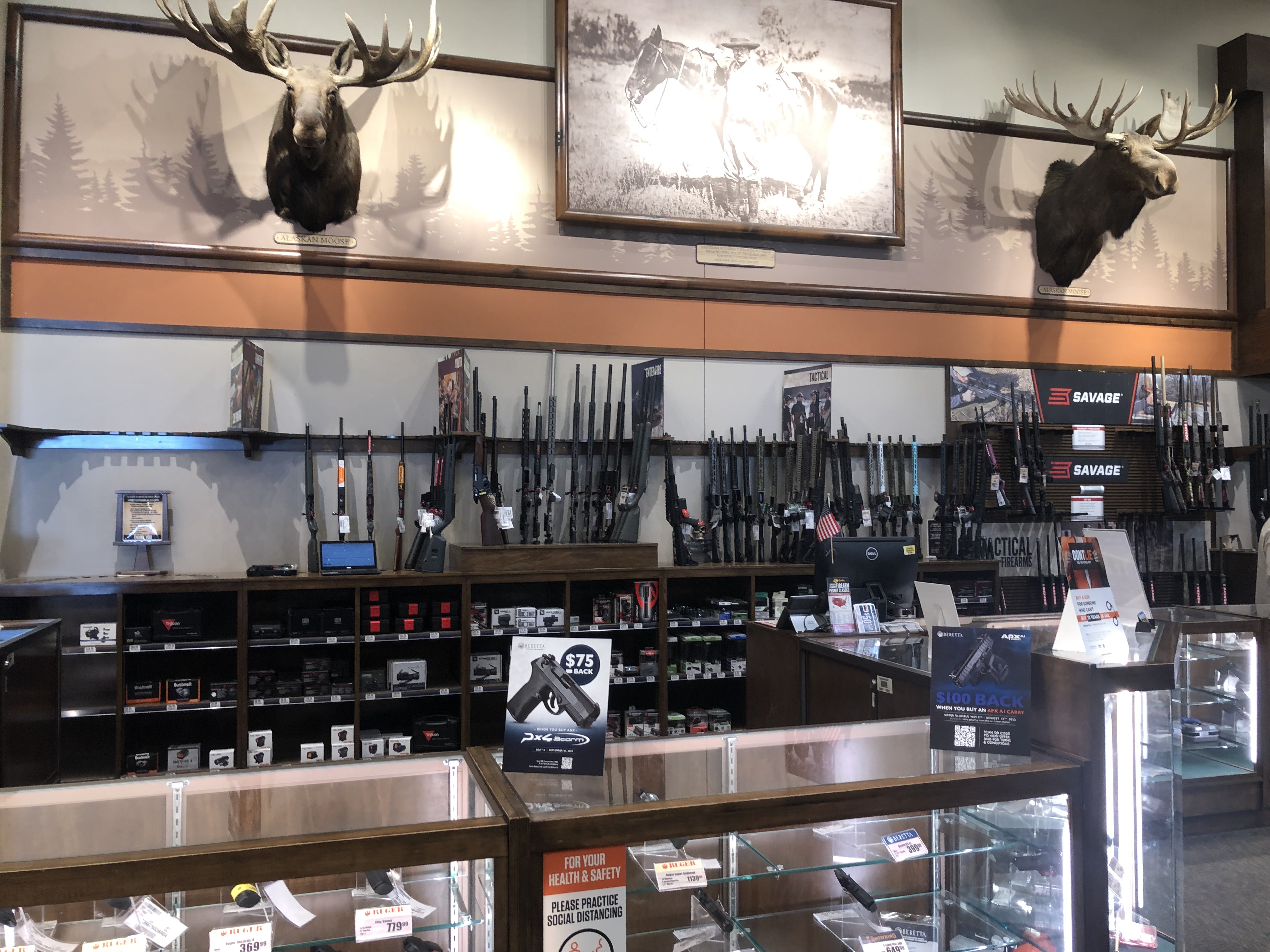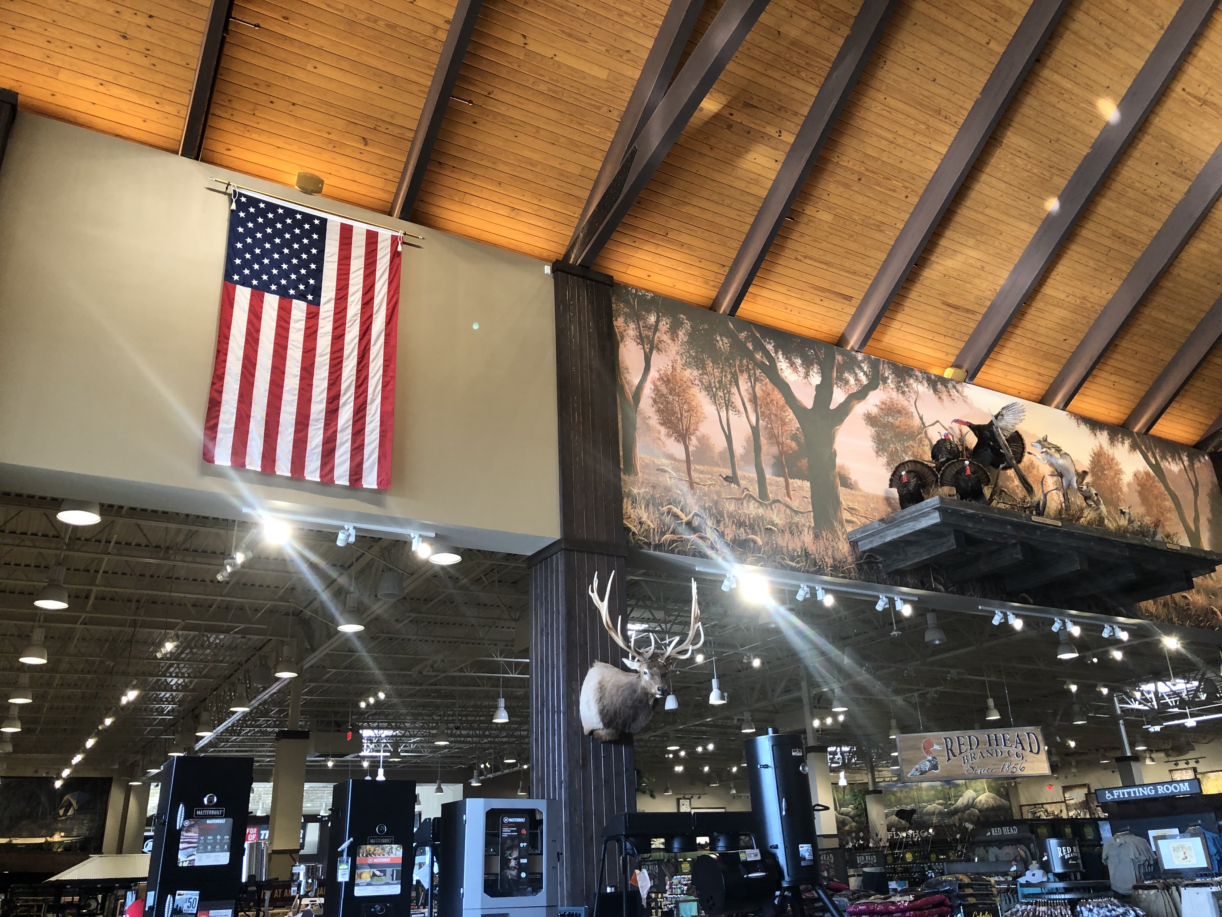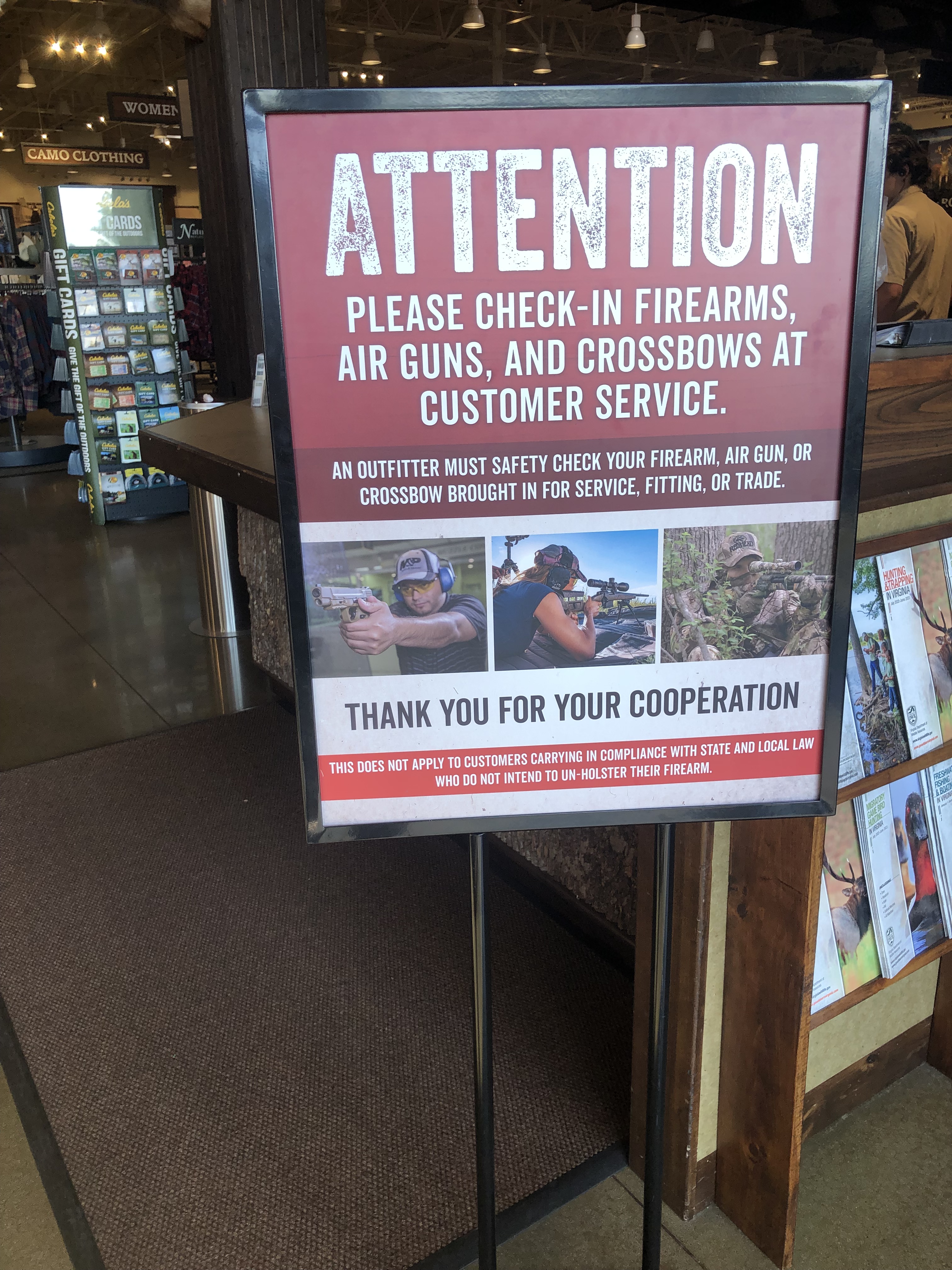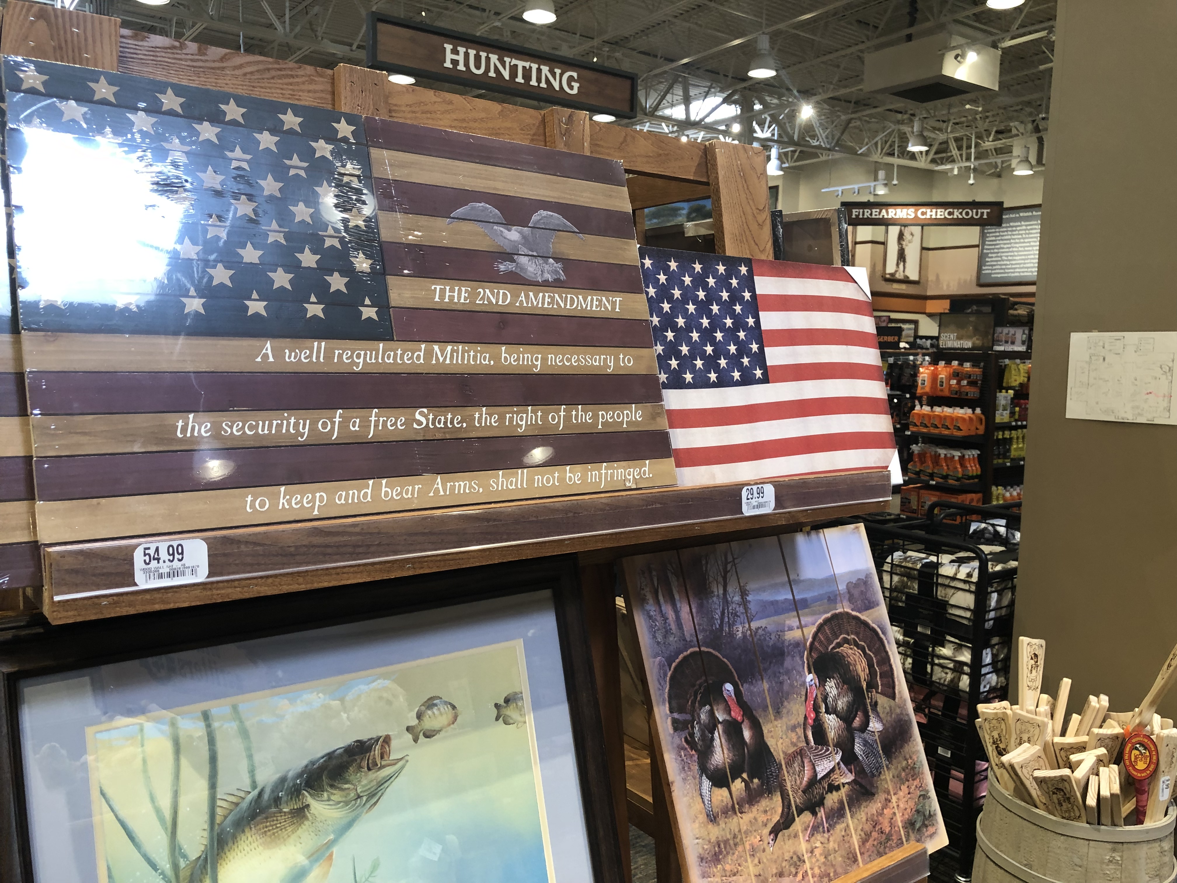 L’autre point qui peut expliquer la décoration du magasin est que Cabela’s a une particularité : environ 20 % du chiffre d’affaires est dérivé de la vente d’armes, de munitions et d’articles assimilés pour la chasse. Ce fut, là aussi, une expérience. Des fusils, des pistolets et des arbalètes sont vendues chez Cabela’s. On trouve également de nombreux écriteaux décoratifs rappelant le Deuxième amendement de la Constitution américaine, qui est l’amendement autorisant les citoyens américains à posséder des armes.