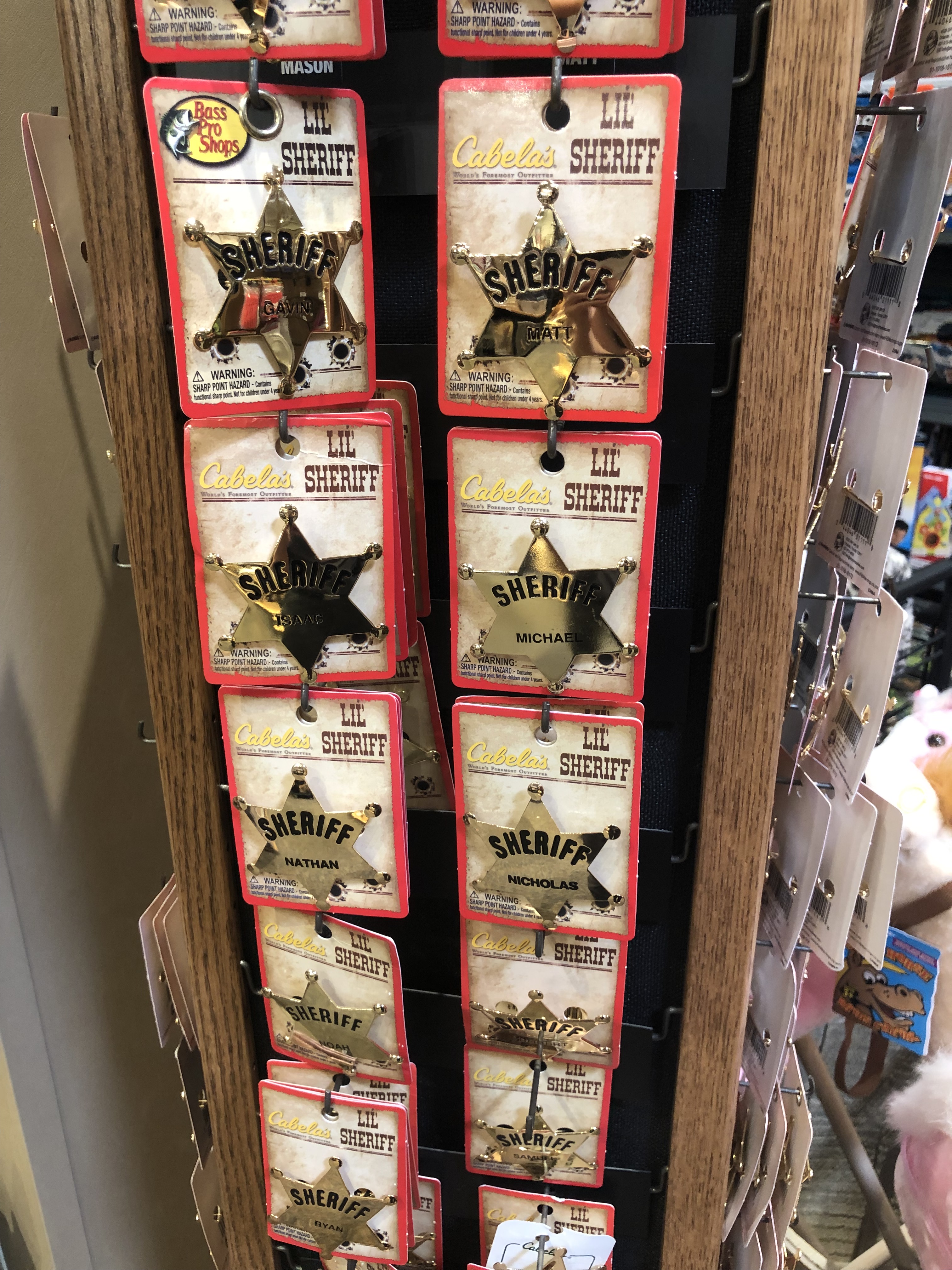La suite de mon tour dans les rayons a été en comparaison d’une ordinarité presque affligeante. J’ai cependant remarqué les vêtements enfants en camouflage et des insignes de shérifs, qui sont des fonctionnaires élus chargés de protéger la population et de faire appliquer la loi sur un territoire donné.
