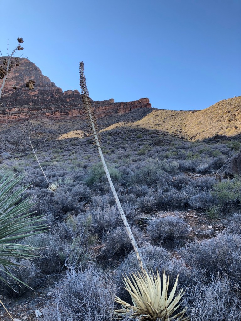 Le rythme de marche est le métronome qui marque les journées du randonneurs. Les sentiers forment des méandres à perte de vue à travers la steppe. Le nombre de sentiers est relativement limité mais il est aisé de se sentir perdu. Les points de repère les plus fiables sont les formations géologiques que l’on apprend à identifier. Les distances ne sont pas indiquées sur les rares panneaux directionnels ; de toute manière, l’unité qui prévaut dans cet espace hors du temps n’est pas le mile mais le « mile du Grand Canyon ». Car même en restant sur un plateau, le dénivelé cumulé au cours d’une journée est conséquent.
