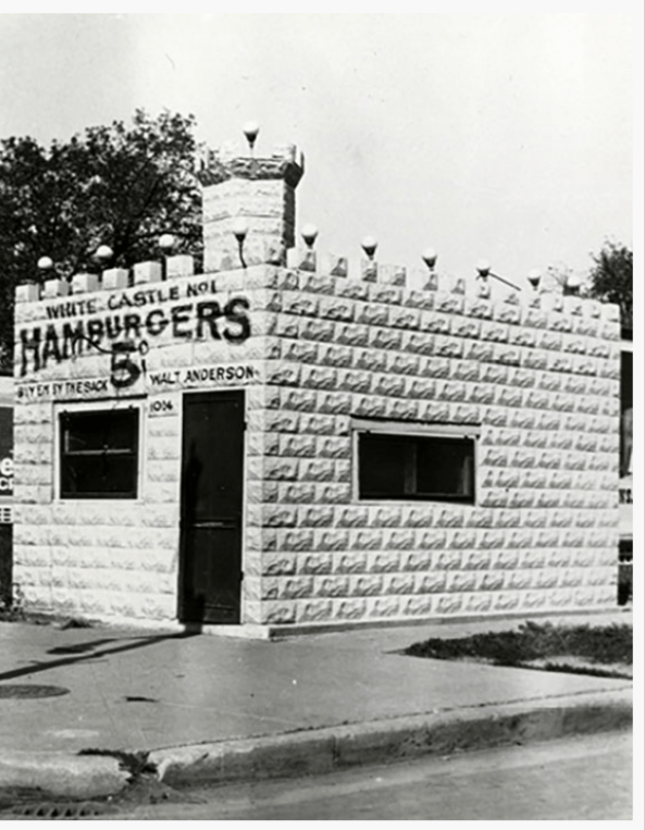 Un restaurant White Castle (littéralement « Château blanc »), construit en blanc et en forme de château. Source : site White Castle, 2024.