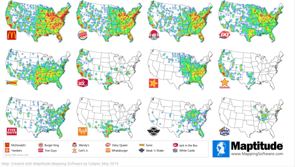 Concentration spatiale des chaînes de hamburgers les plus importantes aux Etats-Unis. Source : https://www.caliper.com/featured-maps/maptitude-burger-chain-restaurants-concentration.html
